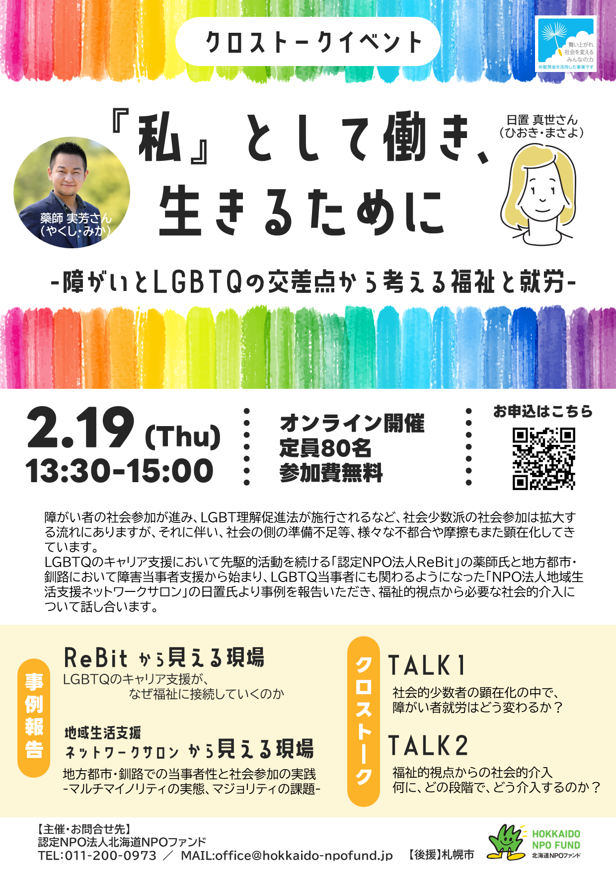 LGBTQのキャリア支援において先駆的活動を続ける「認定NPO法人ReBit」と地方都市・釧路において障害当事者支援から始まり、LGBTQ当事者にも関わるようになった「NPO法人地域生活支援ネットワークサロン」の事例を報告し、福祉的視点から必要な社会的介入について話し合います。