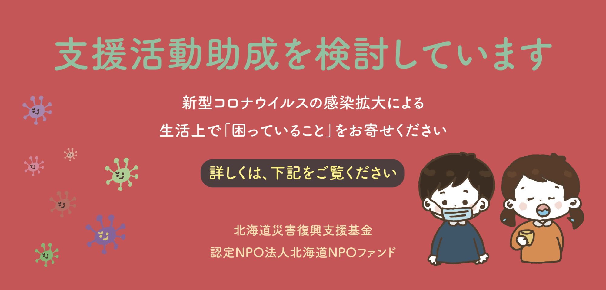 北海道災害復興支援基金では、新型コロナウイルスの影響によるさまざまな課題に対する市民活動を支援していくため、北海道内に所在地のある団体を対象とする「新型コロナウイルス感染症対策市民活動助成」を創設しました。
