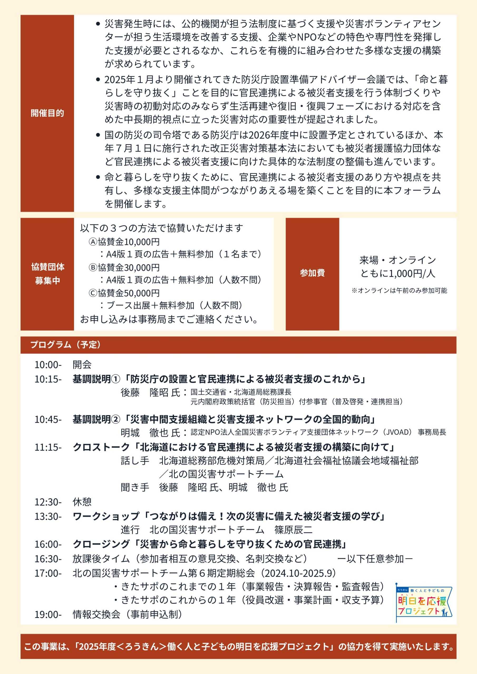 命と暮らしを守り抜くために、官民連携による被災者支援のあり方や視点を共有し、多様な支援主体間がつながりあえる場を築くことを目的に本フォーラムを開催します。